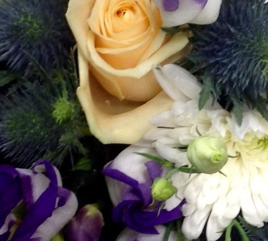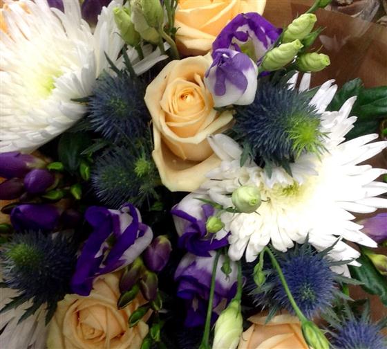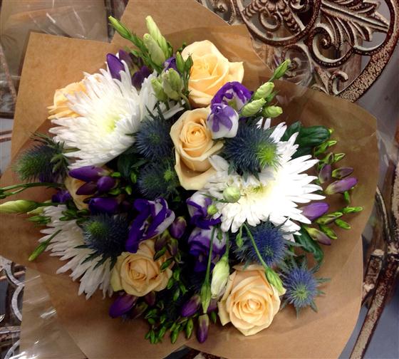 Lovely combination of blue, purple and cream. Including roses, lissianthus and other seasonal flowers.