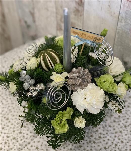 Beautiful black glass cube filled with seasonal flowers & foliage with a taper candle to finish for a perfect table arrangement.