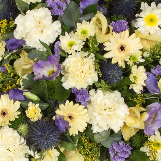 A loose cross of mixed flowers and foliage available as pictured or in a range of colours. As with all tributes please contact us if you require a different colour choice to the ones given.