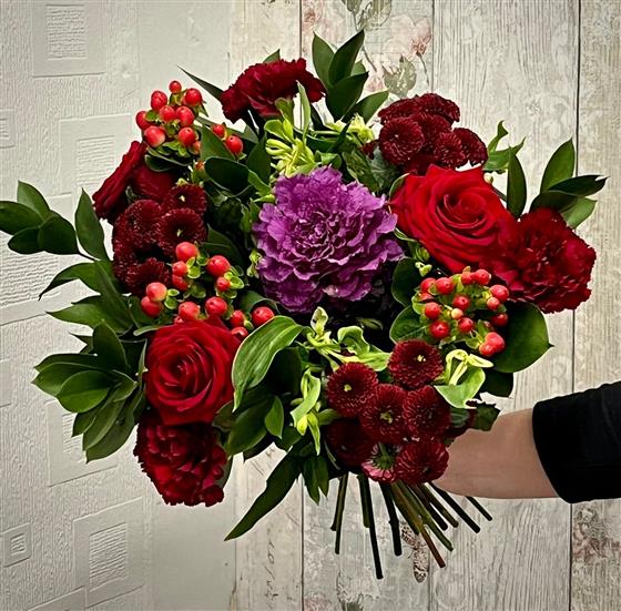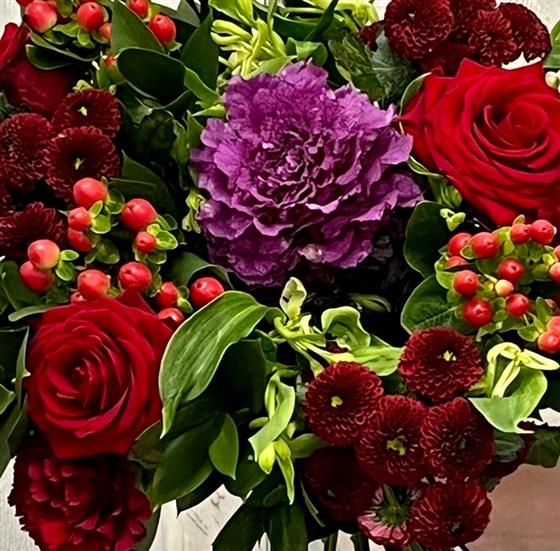 A rich, festive bouquet featuring velvety red roses, burgundy carnations, plush pom chrysanthemums, a regal purple ornamental brassica, and bright hypericum berries. Bold, dramatic, and indulgently seasonal.